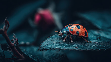 Highly detailed, low-key photograph captures a single, bright orange ladybug adorned with black spots, resting on the serrated edge of a dark, cool-toned leaf. The background is soft and blurred, featuring deep teal or blue shadows and a hint of a deep red, unfocused floral shape. Small water droplets are visible on the insect's shell, highlighting its texture against the somber, contrasting environment.