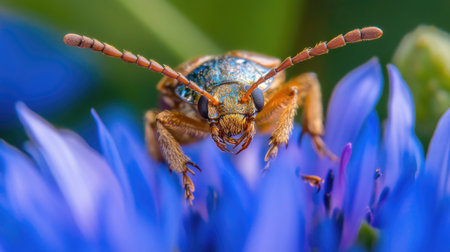 Close-up of a beetle perched on the delicate petals of a blue cornflower in full bloom