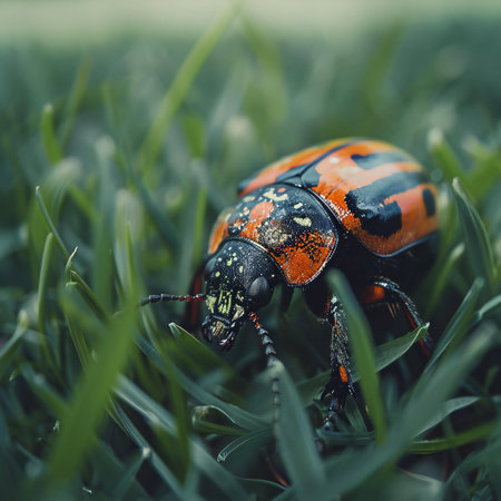 A colorful beetle exploring the textured surface of a leaf, adding a pop of nature's palette to the scene.