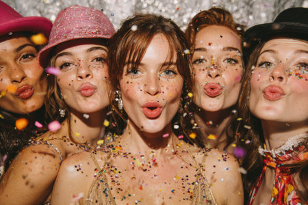 Five women are joyfully celebrating together, adorned in vibrant hats and glittery outfits, with confetti falling around them, capturing a lively and cheerful moment