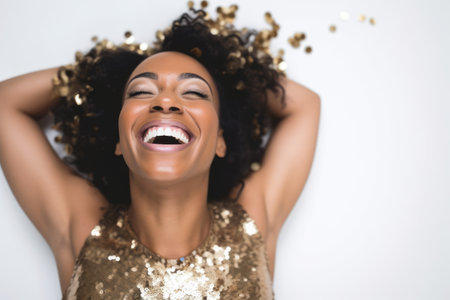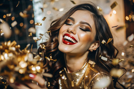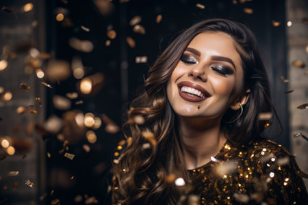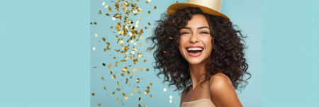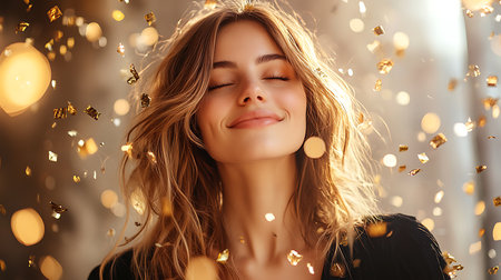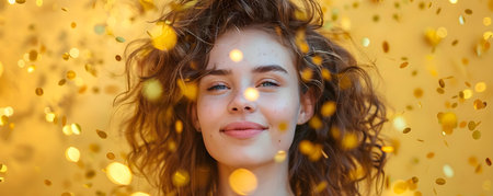 Curlyhaired woman celebrating birthday with gold confetti. Concept Birthday Celebration, Curly Hair, Gold Confetti, Joyful Photoshoot