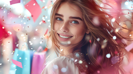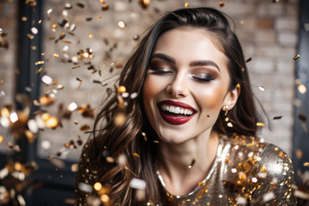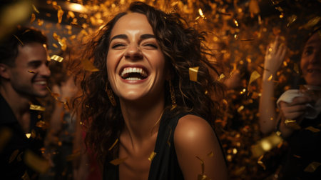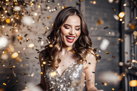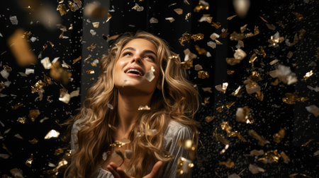 Cheerful young lady surrounded by sparkling confetti. perfect for festive and celebration concepts. A.I.