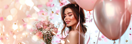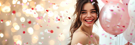 A radiant young woman beams with joy, her arms raised high in celebration against a soft pink backdrop, surrounded by a flurry of colorful confetti. Her sparkling smile and flowing hair capture the essence of happiness and festivity, making this moment feel alive with excitement and carefree spirit.