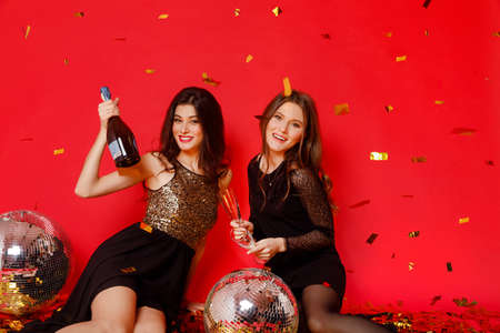 Two happy girlfriends with make-up and red lips sit on the floor with disco balls and drink champagne, golden confetti fly on a red background