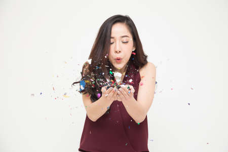 Happy lovely woman send a kiss to camera on white background with confetti. Happy celebration of new year, birthday.