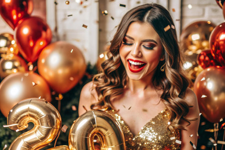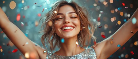 A joyful young woman celebrates the New Year with arms raised in excitement. Surrounded by colorful confetti and vibrant decor, her smile exudes happiness and fun for this festive occasion.