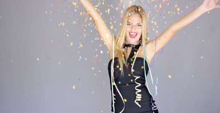 Happy and sexy young woman in evening dress, wrapped in new year party serpentines and floating confetti, dancing while isolated on gray background. She looking at camera and smiling.