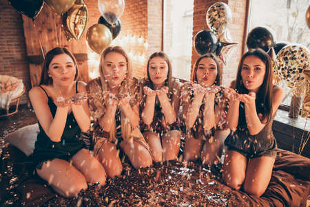 Photo of five cheerful positive luxurious in golden style charming gorgeous fascinating carefree long haired stylish trendy fabulous wonderful ladies students sitting on sheets sending air kisses