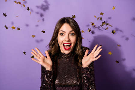 Beautiful happy woman. Party photo. Festive look. Holiday celebration. Pretty excited lady in spangle silver dress enjoying shooting posing on purple confetti decoration copy space.