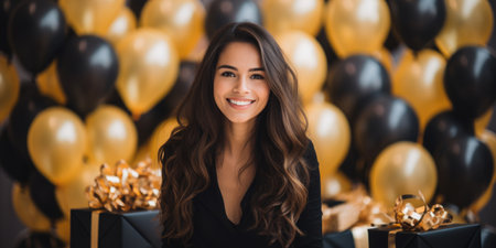 People, joy, fun and happiness concept. happy mixed race birthday woman holding with gift box, gold and black balloons in the background. AI Generated