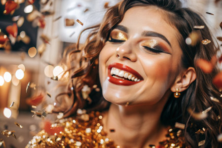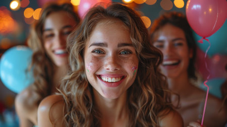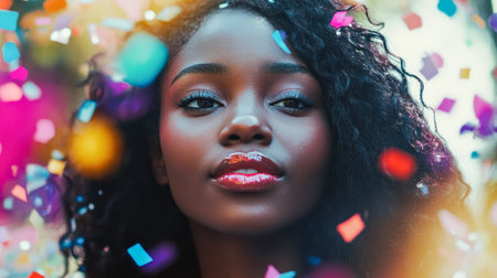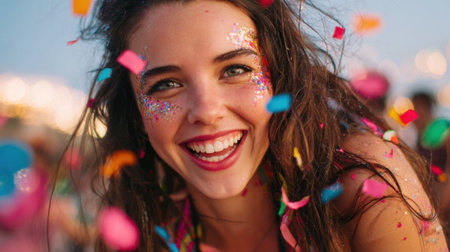 AI Generated. Happy young woman with glitter confetti on face looks ecstatic