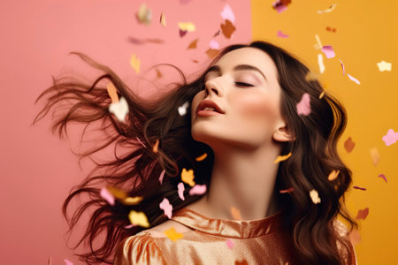 Pretty young woman in an explosion of confetti around her, isolated on colored background. Ai generated.