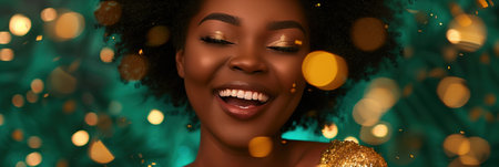 A woman with gold hair and gold makeup is smiling and laughing. She is surrounded by a lot of gold sparkles, which make her look even more radiant and happy. Concept of joy and celebration