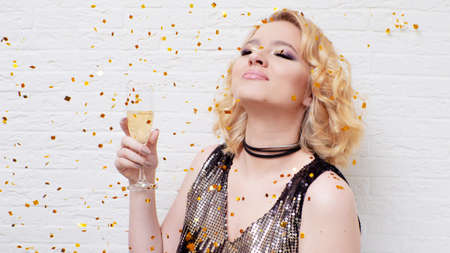 Happy and cheerful blonde with a glass of champagne, celebrating the holiday. New year, beautiful young woman and sparkling confetti, portrait on white background