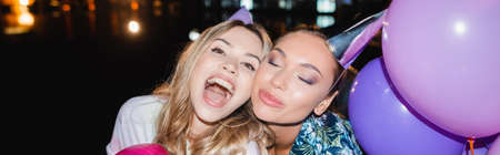 Charming fashionable young women in luxury black dresses making selfie with big balloons with golden tinsels on black background Having fun presents expressing positivity : Generative AI