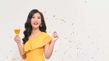 Gorgeous lady in yellow dress hold champagne, throwing confetti on white background.