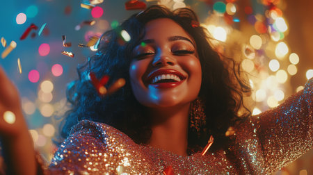 Joyful woman in a sparkling silver dress with confetti falling around, vibrant studio lighting