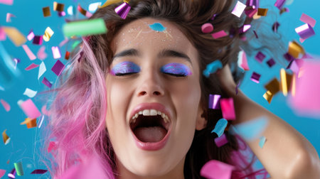 A young woman joyfully celebrates with colorful confetti around her, showcasing vibrant makeup on a bright blue background, embodying pure happiness.