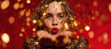 Joyful Woman Blowing Gold Confetti with Red Backdrop and Bokeh Shimmer