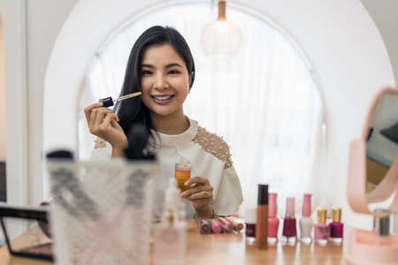 Asian portrait beautiful woman making make-up with brush on face near mirror