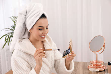 Young beautiful woman in terry white dressing gown makes herself beautiful makeup at home. Model holds makeup brush and cosmetics in her hands. Cozy home.