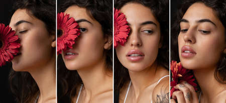 Collage. Portrait of young beautiful woman with red gerbera flower posing isolated over black background
