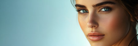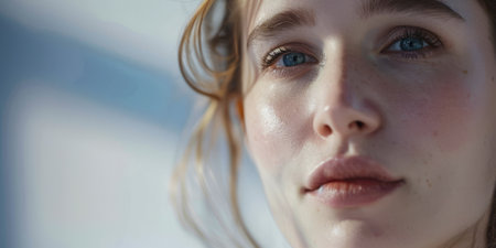 Close up of a woman with stunning blue eyes and flawless skin, radiating beauty in natural light for a striking visual impact.