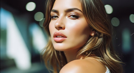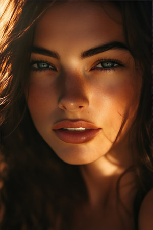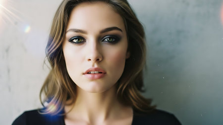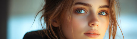 Woman with striking green eyes and smooth skin shows off her natural beauty in close-up portrait. Her soft, flowing hair complements her serene and confident expression, creating intimate atmosphere