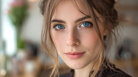 A young woman stands in front of a bright background, showing her mesmerizing blue eyes and natural beauty. Her soft expression and tousled hair create an engaging and captivating atmosphere.
