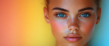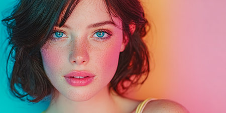 A young woman looks directly at the camera, showcasing her blue eyes and freckles, with a vibrant gradient background enhancing her features.
