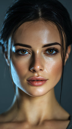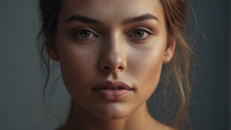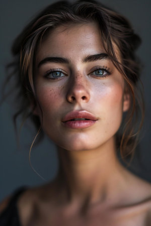 Close-up portrait of a woman with natural beauty and soft expression in subdued lighting