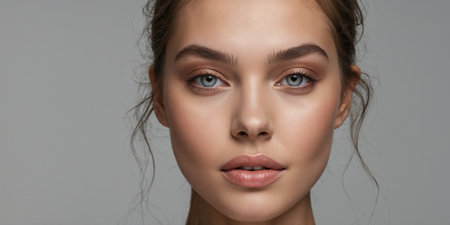 A beauty close-up featuring a woman with light, naturally shaped eyebrows, with soft makeup to enhance her facial features and a blurred background for focus.