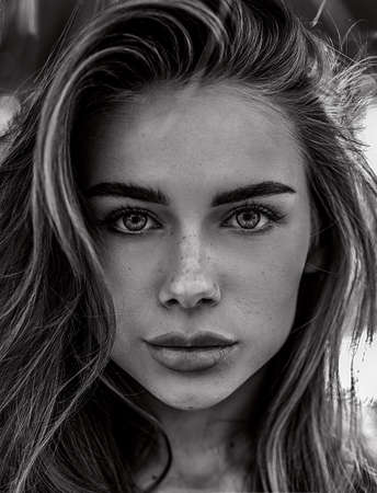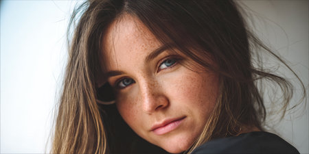 A young woman gazes intently into the camera with long, flowing hair framed by natural light. Her captivating blue eyes and subtle freckles add to her unique beauty.