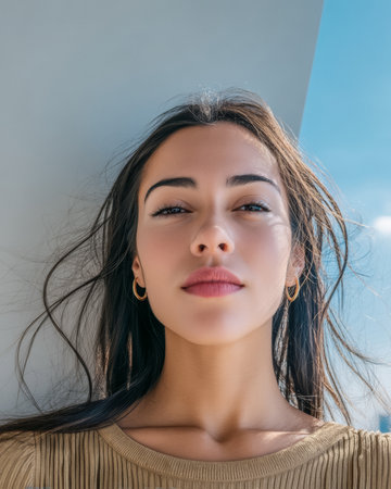 A young woman stands outdoors with gentle breezes tousling her hair. Bright sunlight illuminates her face, creating a serene and peaceful atmosphere.
