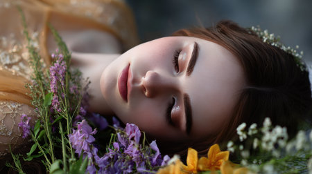 A tranquil portrait of a young woman lying among a bouquet of colorful flowers, showcasing her serene expression and natural beauty in soft lighting.