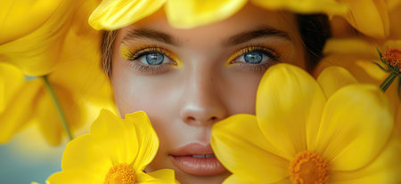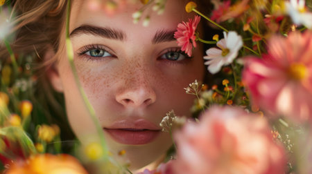 Close-up of a young womans face partially obscured by vibrant flowers, conveying a sense of beauty and nature. Enchanting Floral Gaze. lush summer floral arrangement, captivating gaze. AIG50