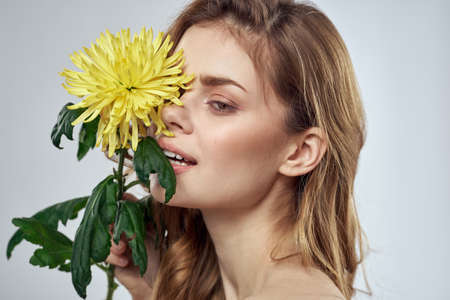 Portrait of a beautiful woman with a yellow flower on a light background charming smile model red hair