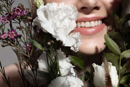 Young woman with charming smile and colorful blooming plants