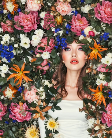 Surreal collage of a fashion portrait of beautiful young woman with flowers surrounding her.