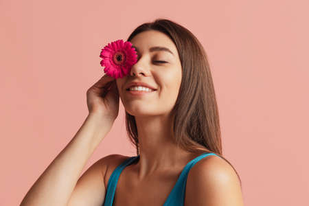 Half-length portrait of pretty girl with flower posing isolated over pink studio background. Natural beauty concept.