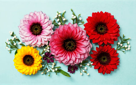 Colorful daisies and chamomile flowers on blue background