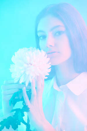 Beauty portrait. A beautiful brunette girl with a delicate chrysanthemum flower, surrounded by a light haze. Make-up and cosmetics. Perfumery.