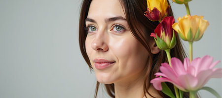A young woman with dark hair and striking eyes gently holds a vibrant orange and pink flower near her cheek against a neutral background.