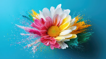 A dynamic explosion of colorful petals and brushstrokes in an abstract art style.