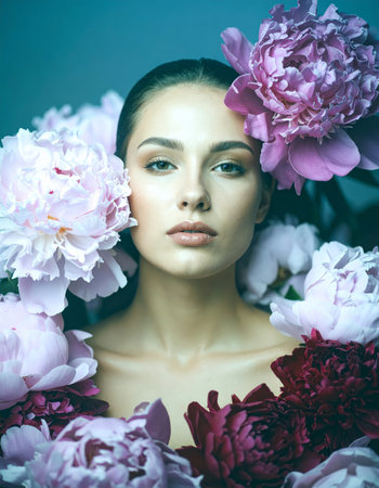 A beautiful woman with elegant makeup, framed by a sea of lush pink and magenta peony flowers. A luxury concept for beauty, skincare, spa, and fragrance. High quality photo