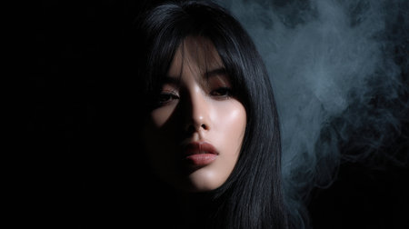 A captivating portrait of a mysterious woman with dark hair, softly illuminated in a dark setting, creating an ethereal atmosphere with smoke effects.
