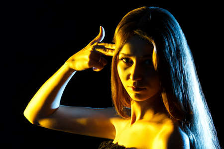 Close up portrait of millennial pretty korean woman with long hairstyle with neon light. Hipster teenager in studio