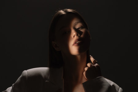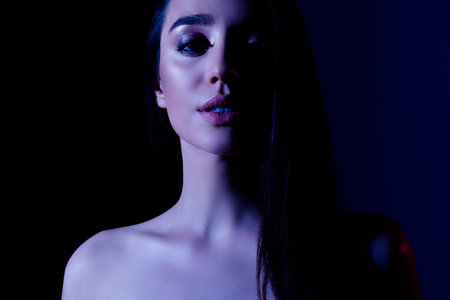 Artistic beautiful woman with long hair looking sexy. Shadow on half face. Closeup art portrait