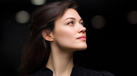 a woman in a black top gazes directly at the camera, illuminated by soft, atmospheric lighting. her elegant and emotive face captivates the viewer. this stunning portrait, taken with a canon eos 5d mark iv, showcases symmetrical asymmetry and graceful lines. with its chiaroscuro style, this captivating image has earned the title of contest winner. ai generated