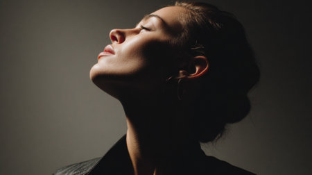 This striking portrait showcases a woman with radiant skin, beautifully highlighted by soft lighting. Her calm expression exudes elegance and grace against a dramatic backdrop.